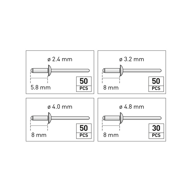 vakszegecsanyákkal: 5 darab 2,4 – 5 darab 3,2 – 5 darab 4, – 3 darab 4,8 mm