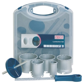 5 db keményfém hegyű DM 33/53/67/73/83 mm-es fúrógyűrűvel, reszelővel, szerelőlappal és vezetőfúróval praktikus műanyag tokban, falazat, csempe, tégla, gipszkarton stb. könnyű fúrásához.