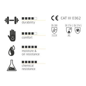 varrat nélküli ipari kesztyű nitril-PVC keverékből | További nitril homokos bevonat a tenyérrészen az extra jó tapadás érdekében | nagyon nagy rugalmasság alacsony hőmérsékleten is | olaj- és vegyszerálló