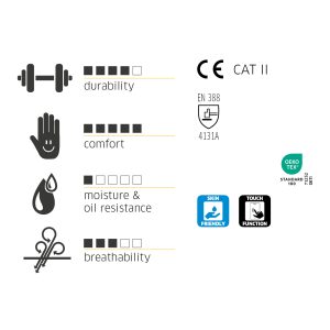 varrat nélküli, könnyű szerelőkesztyű | nitril bevonattal homokos bevonattal | jó illeszkedés és magas viselési kényelem | kifejezetten rézszálas érintőképernyős működéshez tervezve | jó ellenállás az olajokkal és zsírokkal szemben